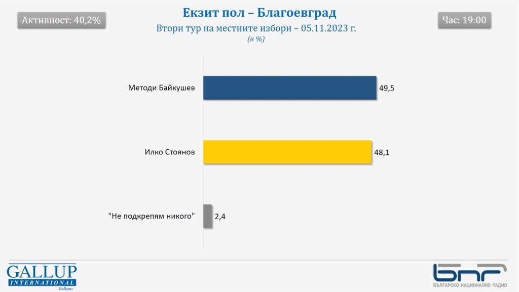 Според социологическите данни от Exit poll на Галъп Интернешънъл Болкан – партньор на БНР в настоящите избори, към 19:00 часа досегашният кмет на Благоевград, Илко Стоянов, /независим кандидат, подкрепен от ГЕРБ/, печели 48,1 процента от имащите право на глас. Опонентът му, Методи Байкушев, кандидат на Коалиция ПП „Продължаваме промяната“ – Демократична България“, е предпочетен от 49,5 процента избиратели.
