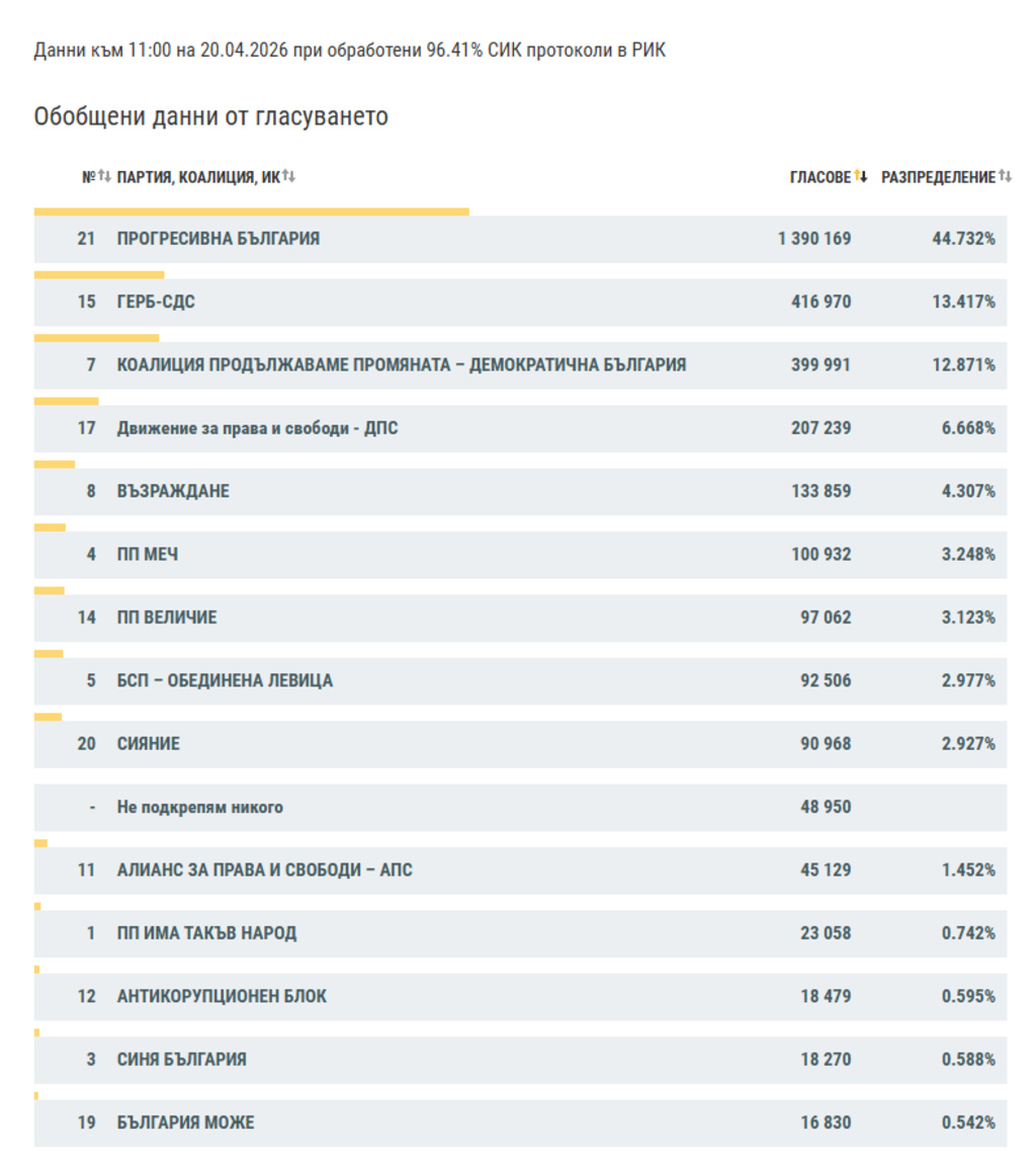 При 96,41% обработени секционни протоколи от предсрочните парламентарни избори "Прогресивна България" получава 44,73% от вота, показват данните на ЦИК.