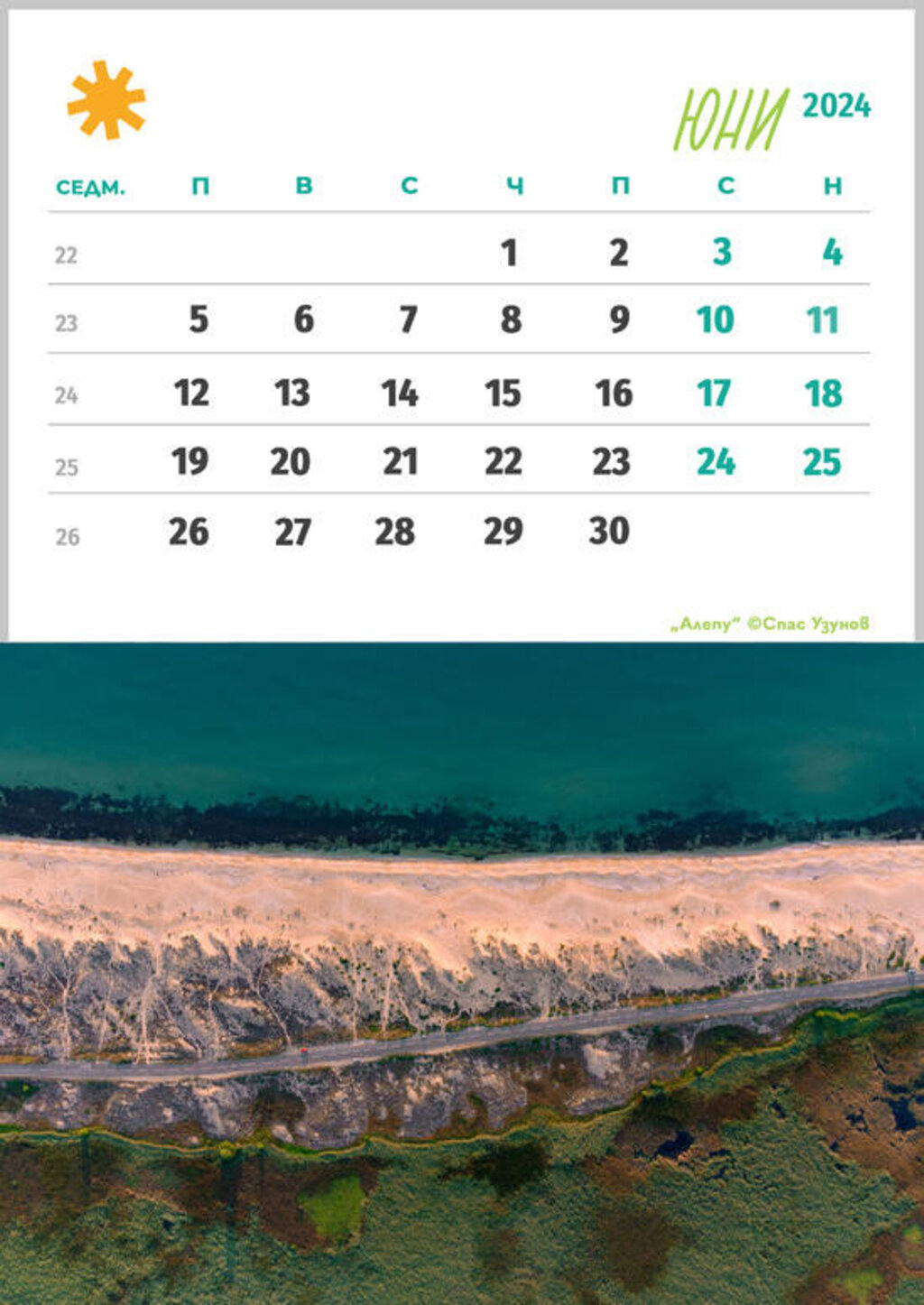 "Една от най-красивите дюни е бургаската до Морска гара. В календара тя влиза с една снимка с жълти и сини чадъри. Ще я представим през тази година. Естествено Алепу с Шофьорския плаж-кадърът е от високо и се вижда морето, дюните, пътя и блатото. Може би най-дългата запазена ивица пясъчни дюни е тази на Камчийски пясъци, едно място, което оцелява,надяваме се по-дълго. На плажа на Поморие има много красиви дюни."