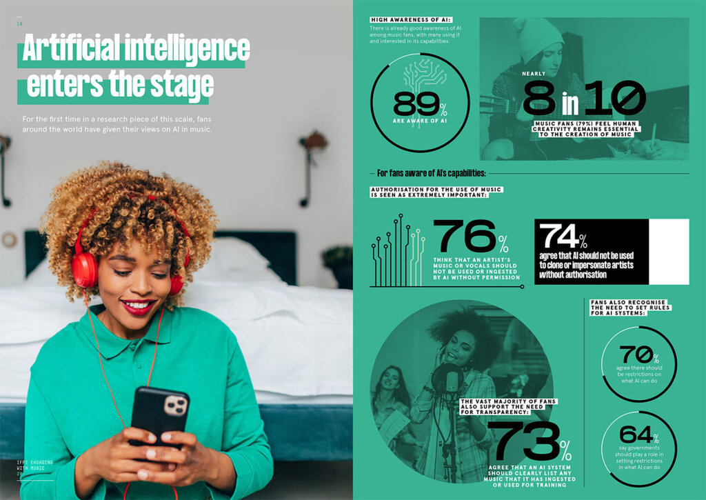 Допитаните са наясно със съществуването на изкуствен интелект като 79% казват, че човешката креативност трябва да се уважава при създаването на музика. 76% смятат, че музиката на артист или техния глас не трябва да се използват без разрешение. Данните по въпроса за изкуственият интелект не са изненадващи, но са важна илюстрация в момент, в който законодатели обмислят как да отвърнат на бързо развиващите се технологии.