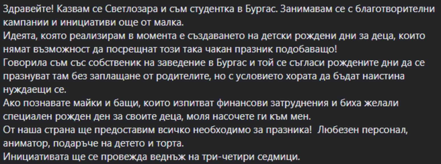 Идеята за инициативата с рождените дни ѝ хрумва преди дни. Тя е работила в детски център и е виждала колко пари са нужни на родителите, за да отпразнува детето им своя личен празник: