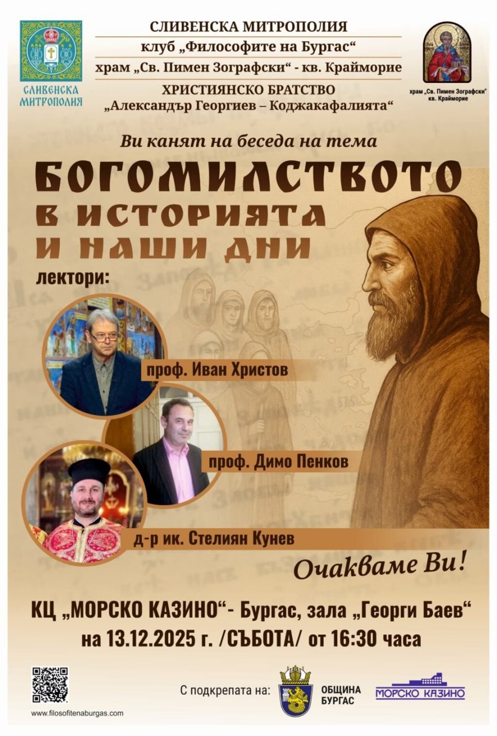 Беседа на тема: "Богомилството в историята и наши дни" ще се проведе тази седмица в Бургас. Лектори ще бъдат проф. Иван Христов, проф. Димо Пенков и иконом д-р Стелиян Кунев.