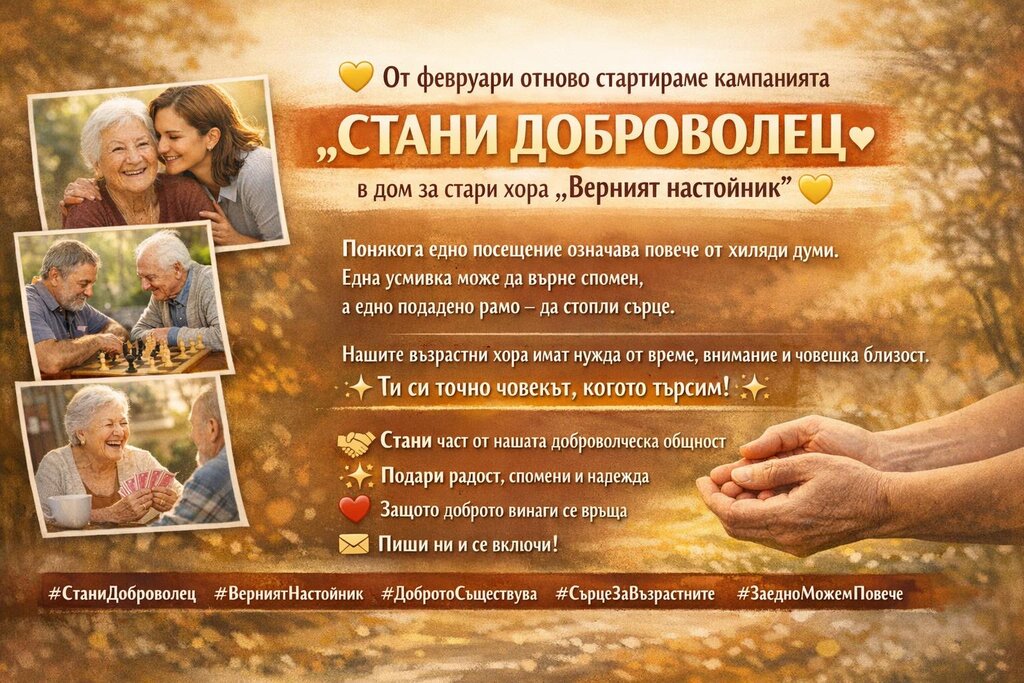"Възрастните хора, които живеят тук приемаме с уважение, обич и достойнство. При нас грижата за тях не е просто ежедневие, тя е призвание, търпение и сърце. Идеята на тази наша инициатива е, който желае да ни посети и да се срещне и общува с нашите потребители. През годините сме имали много доброволци от чужбина и решихме да предизвикаме и българската общност да се включи. Нашите възрастни хора имат нужда от време, внимание и човешка близост!", съобщи председателят на УС на СНЦ „Верния настойник“ Жельо Желев.