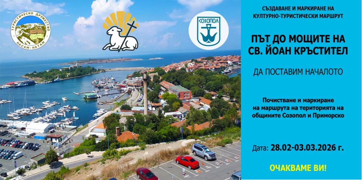 Първата доброволческа акция за почистване и маркиране на отсечки от маршрута "Път до мощите на Свети Йоан Кръстител" ще се проведе от 28 февруари до 3 март 2026 година. Инициативата започва от Созопол и се организира съвместно от местната община, ТД "Насам-натам" и едноименното сдружение.