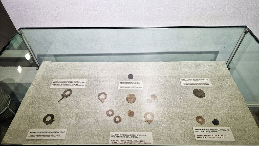 Eine Vitrine mit kleinen Votivspiegeln im Archäologischen Museum in Burgas ist Teil einer größeren Ausstellung über die Geschichte dieses Kulturinstituts. Sie ist der weiblichen Schönheit in der Antike gewidmet und wurde "Launen in der Antike. Blick in den Spiegel" betitelt und anlässlich des 8. März, des Internationalen Frauentages, eingerichtet.