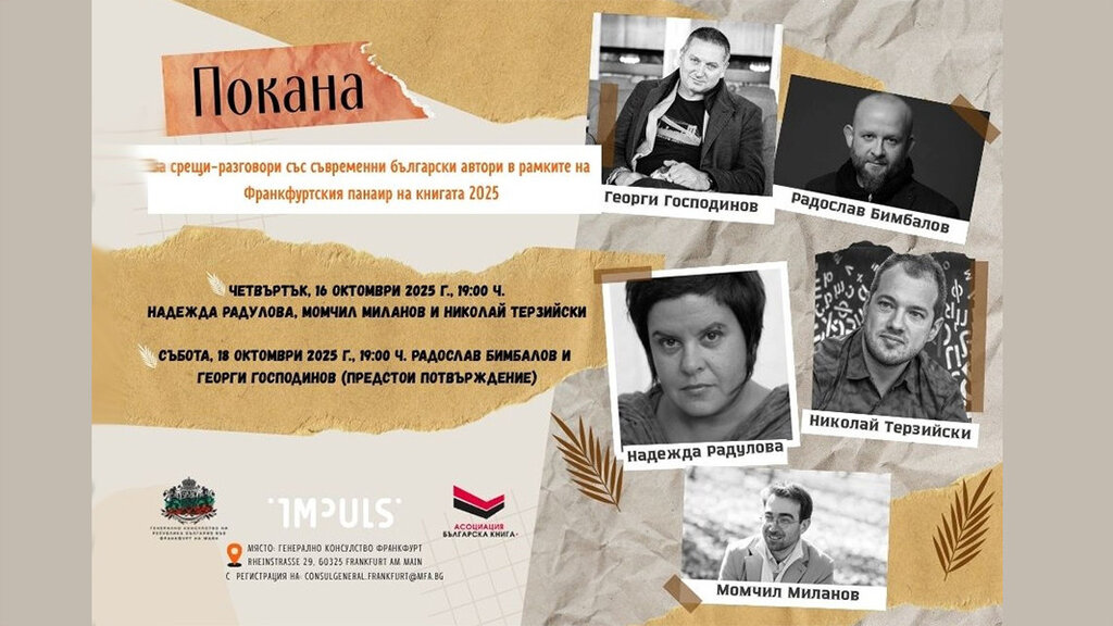 Das Generalkonsulat der Republik Bulgarien in Frankfurt am Main, die Vereinigung „Bulgarisches Buch“ und der Deutsch-Bulgarische Verein Impuls Frankfurt e.V. laden zu literarischen Gesprächsrunden mit führenden zeitgenössischen bulgarischen Autoren im Rahmen der Frankfurter Buchmesse 2025 ein, wie aus einem Beitrag auf der Facebook-Seite der diplomatischen Vertretung hervorgeht.