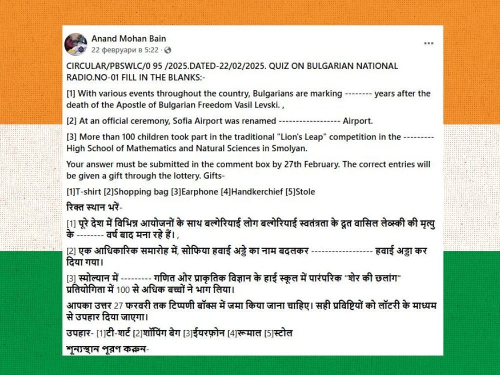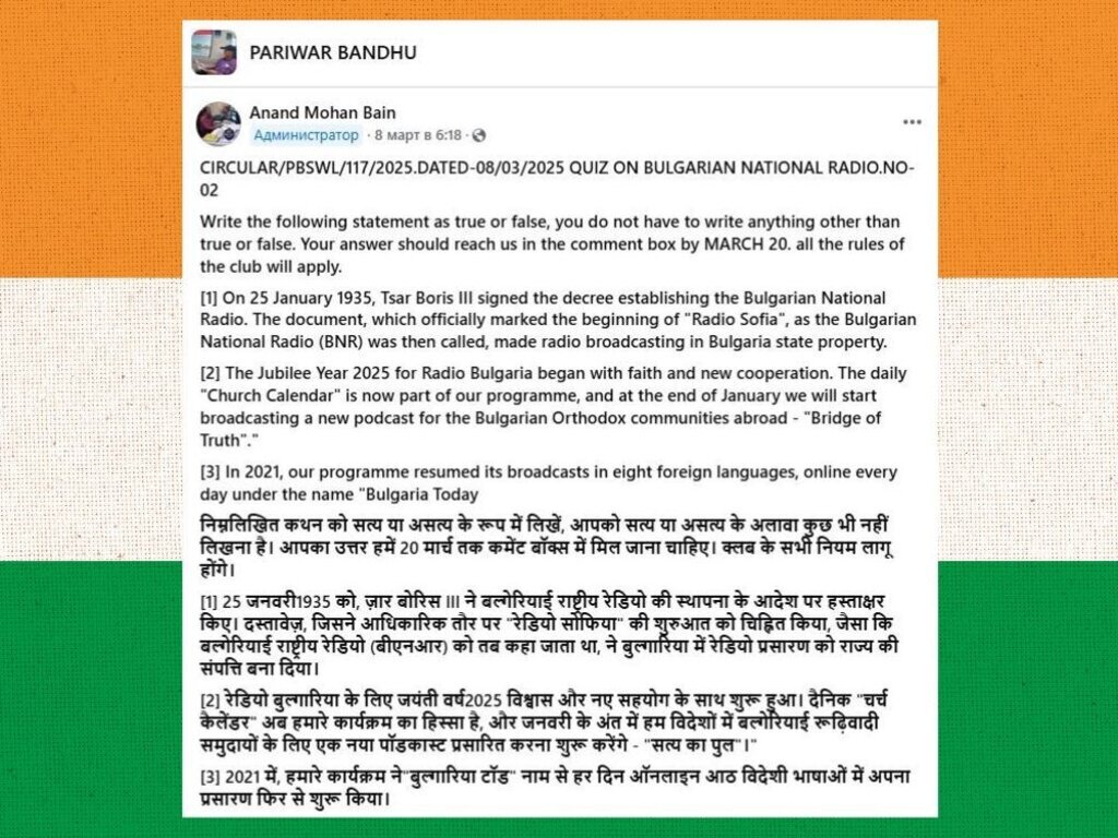 „Als regelmäßiger Hörer des Bulgarischen Nationalen Rundfunks – Radio Bulgarien freue ich mich, Ihnen mitzuteilen, dass einer meiner Landsleute, Herr Anand Mohan Bain, Vorsitzender des Radioklubs Pariwar Bandhu SW, sein erstes Quiz zum Thema ‚Bulgarischer Nationaler Rundfunk‘ für mehr als 300 Mitglieder veranstaltete. Der Wettbewerb stieß auf großes Interesse“, schrieb Herr Chakrabarty in einer E-Mail an unsere Redaktion. „101 Mitglieder aus verschiedenen Nachbarländern beteiligten sich, 87 gaben richtige Antworten.“