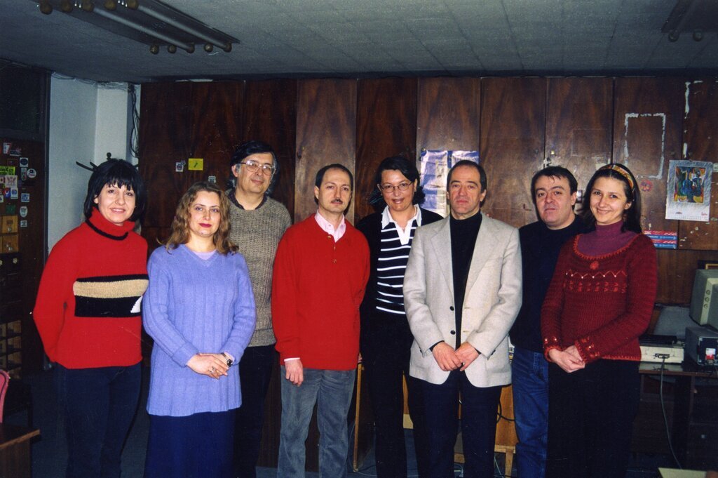 Foto aus dem Jahr 2000. Von links nach rechts: Vera Dobreva, Albena Kostowa, Georgetta Janewa, Vessela Vladkova, Rossiza Radulowa, Alexander Alexandrow, Wladimir Wladimirow (mit dem Kätzchen), Petar Georgiew, Wladimir Daskalow und ganz vorn Aleko Djankow