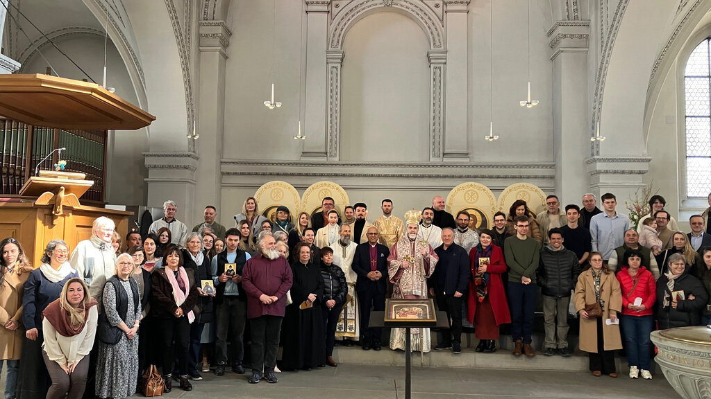 Metropolit Antonij und Botschafter Swetlan Stoew (in der Mitte) inmitten der Bulgaren der bulgarischen orthodoxen Kirchengemeinde in Zürich