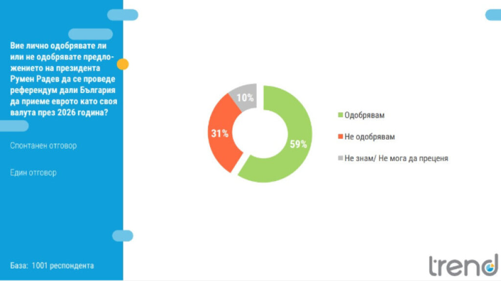 59 Prozent der Befragten befürworten die Initiative von Präsident Rumen Radew, ein Referendum über die Einführung im Jahr 2026 der einheitlichen europäischen Währung abzuhalten, während 31 Prozent dagegen sind.