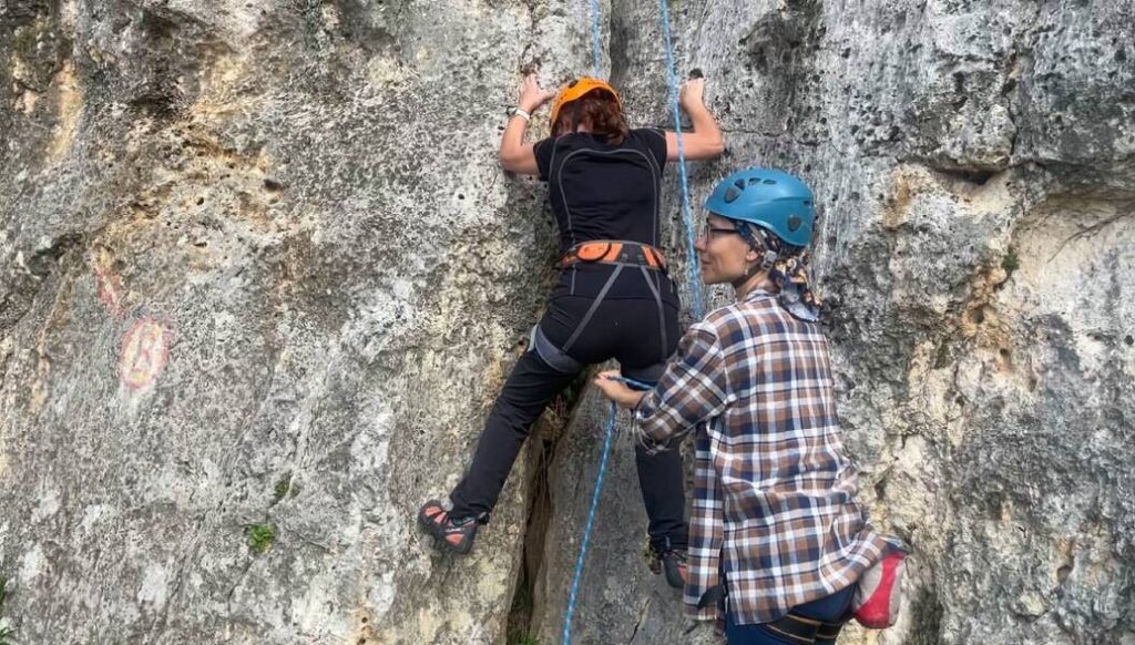 First steps in rock climbing are made with the help of an instructor
