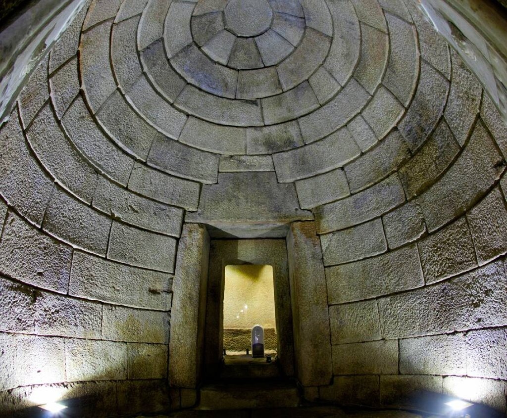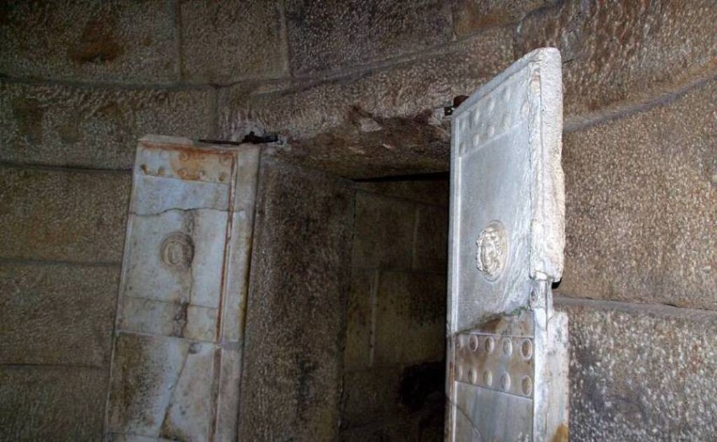 The tomb itself was built two centuries before the symbolic burial of King Seuthes III. There are theories that prior to it the structure was originally used as a temple. A 13 metre long dromos (corridor) with a beamed ceiling leads further inside. One then goes through the first stone door, which leads into a rectangular chamber. A horse skeleton on the stone slabs on the floor tells of a sacrifice. Another stone door with two wings leads into the next circular room. The wings are decorated with raised protective medallions depicting the Gorgon Medusa and Helios. The highest point in the vault of the massive dome in the circular room is 4.5 metres high. Three teeth of a 12-year-old child and a branch of a golden wreath were found on the floor.