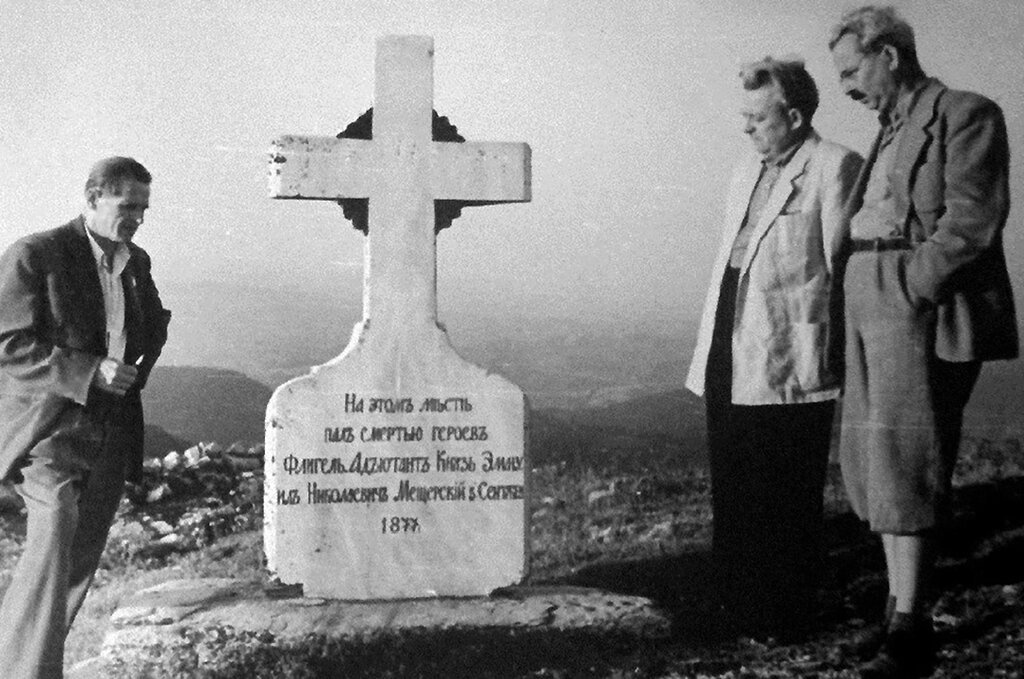 Sergei Vasilyiev (first from the left) in front of the monument to Prince Emnanuel Nikolaevich Meshchersky, who died on Mount St. Nicholas (Shipka peak) on September 5, 1877