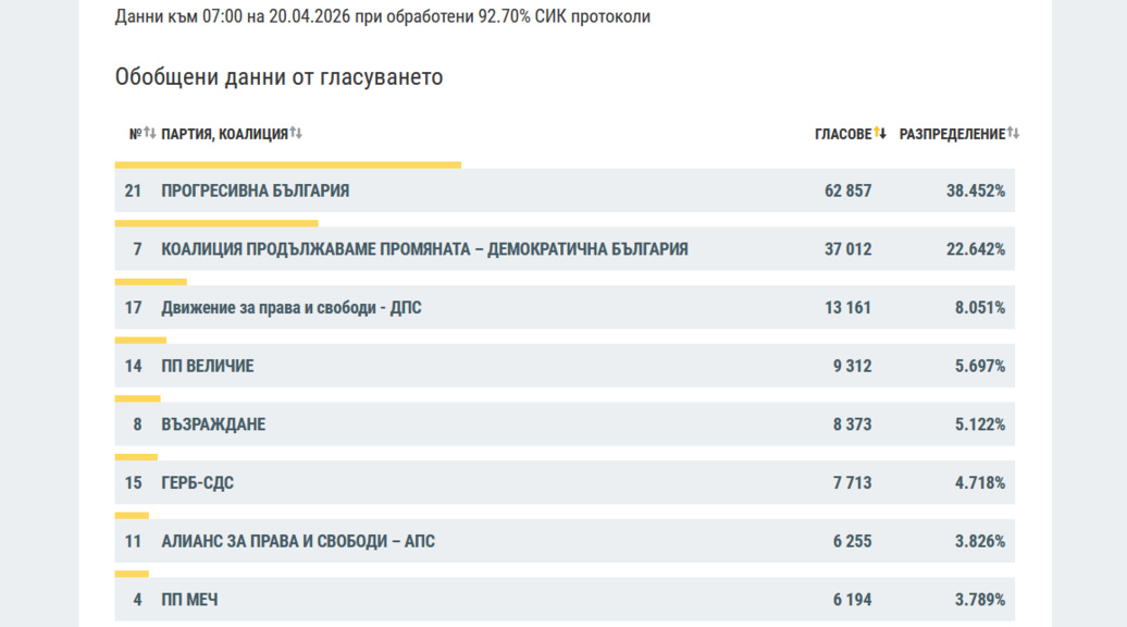 “Progressive Bulgaria” is also leading in the preferences of Bulgarians abroad. The formation of Rumen Radev has received 69,903 votes, or 38.15% of the total, with 98.8% of precinct protocols processed by the Central Election Commission (CEC).