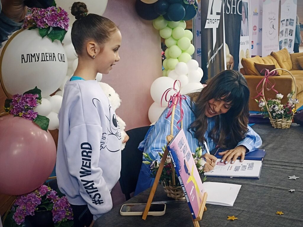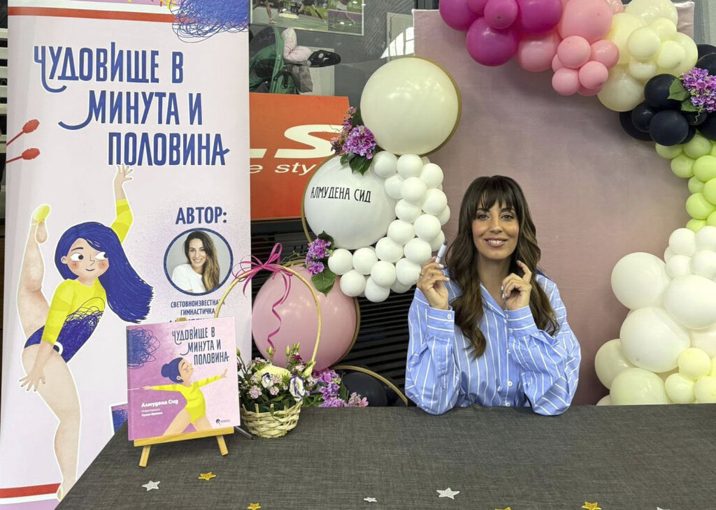 El pasado 16 de mayo, Almudena llegaba a Bulgaria para presentar su libro infantil “Monstruos de minuto y medio”, ahora traducido y publicado en búlgaro. El mismo día, en el corazón de los Jardines de Boris, en Sofía, comenzaba el torneo internacional Slavia Cup, el evento más importante de gimnasia rítmica del país, donde también tendría lugar la presentación del libro. La Editorial Mechenósets y el Instituto Cervantes de Sofía organizaron un encuentro que, sin duda, será recordado para siempre por cientos de niñas - grandes y pequeñas - que se llevaron a casa su edición firmada.