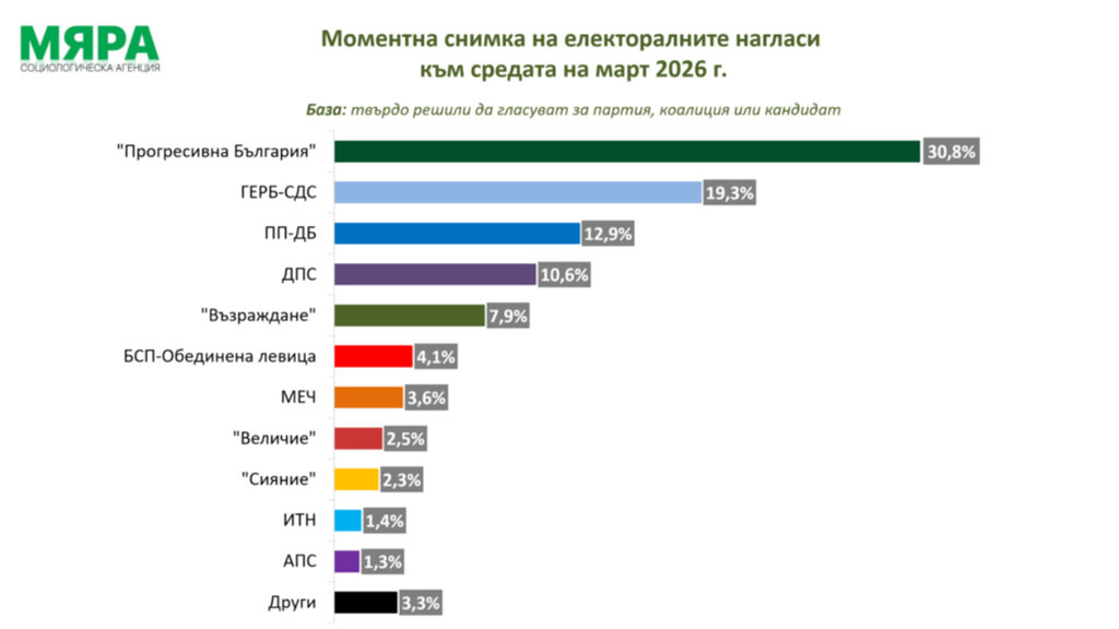 Si las elecciones se celebraran a mediados de marzo, el apoyo de quienes afirman que votarán por un partido concreto, por una coalición o un candidato, se distribuiría de la siguiente manera: la formación de Rumen Radev, “Bulgaria Progresista”, obtendría el 30,8 % de los votos; GERB-SDS, el 19,3 %; Continuamos con el cambio-Bulgaria Democrática (PP-DB), el 12,9 %; DPS-Nuevo Comienzo, el 10,6 %; y “Renacimiento”, el 7,9 %. En torno al umbral electoral se situaría el BSP-Izquierda Unida, con un resultado actual “al borde” del 4,1 %, quedando no muy lejos del MECH, que cuenta con un 3,6 %. “Grandeza” obtendrían un 2,5 %,y “Siyanie” entran claramente en la lucha, con un 2,3 %. “Hay tal nación” (ITN) obtendría un 1,4 % y el APS, un 1,3 %.