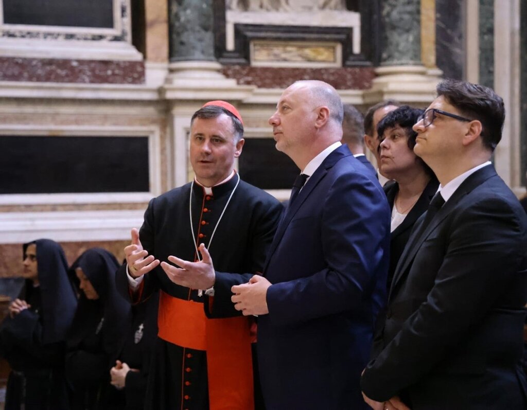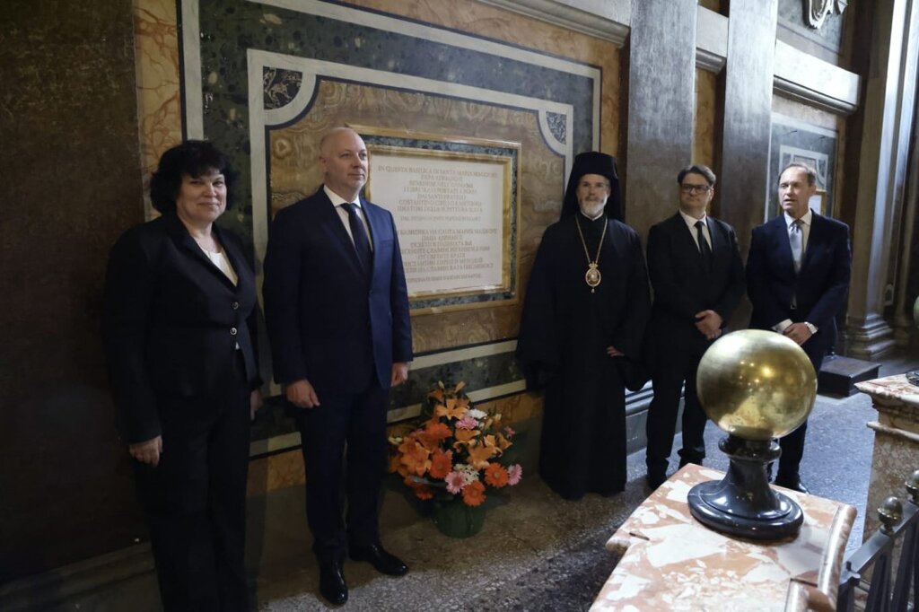 Plus tard, le premier ministre a visité la basilique "Sainte Marie Majeure" où en 867 le pape Adrien II consacre l'alphabet et les livres en alphabet slave, comme annoncé par le service de presse du gouvernement. Au IXe siècle, à Rome, le pape reçoit les deux Saints frères Cyrille et Méthode et les proclame Apôtres des Slaves avant de bénir leur œuvre magistrale. En 1980, le pape Jean-Paul II proclame Cyrille et Méthode co-patrons de l'Europe.