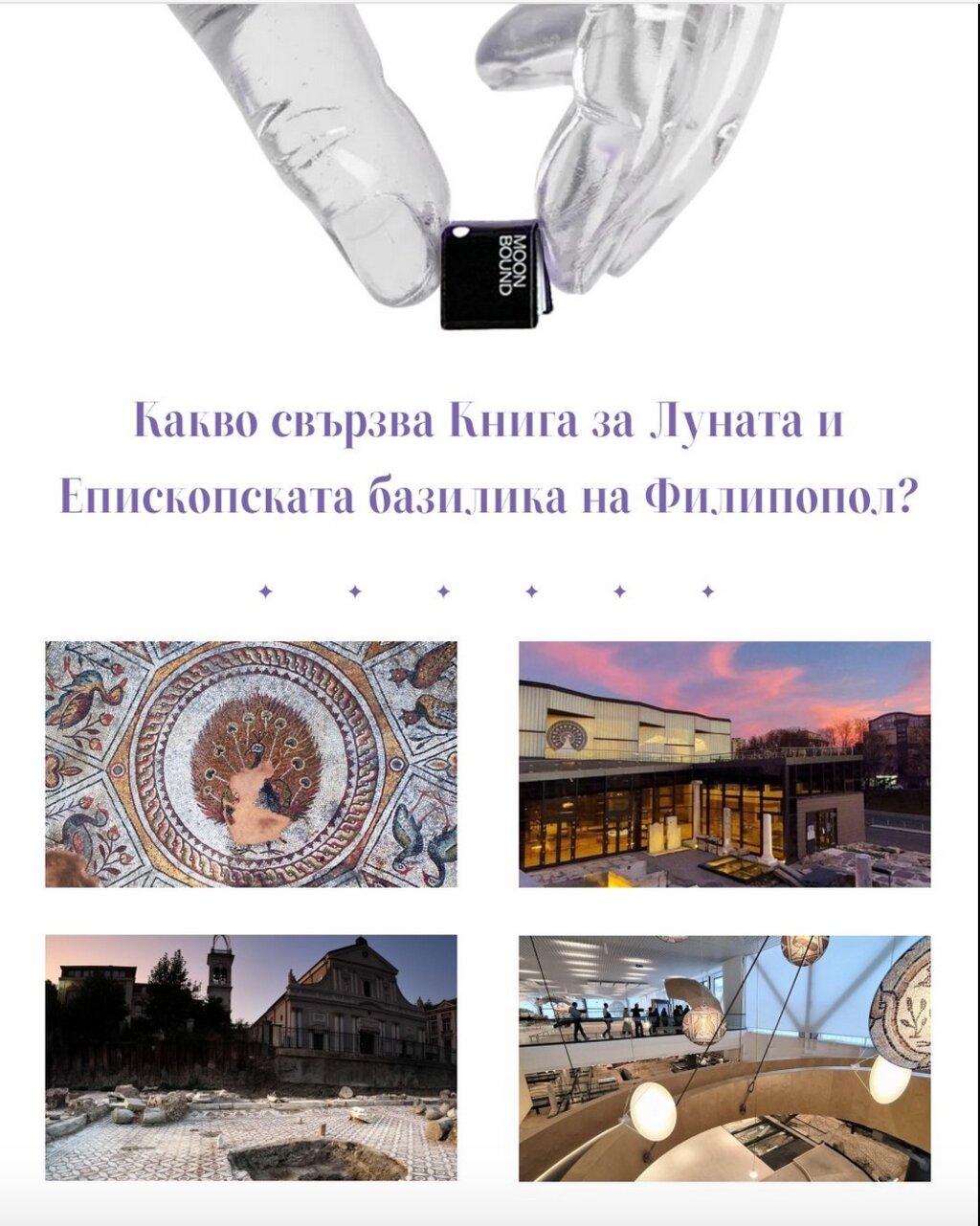 La Basilique épiscopale de Plovdiv propose une réponse ce 23 février avec "Moon Bound" (Le livre sur la Lune). Ses 80 pages réunissent textes et images imprimées à 5760 pixels sur un inch (2,5 cm). L’art cosmique englobe non seulement des images d’astronautes ou des illustrations de science-fiction, mais examine le Cosmos comme partenaire à part entière dans le processus créatif.