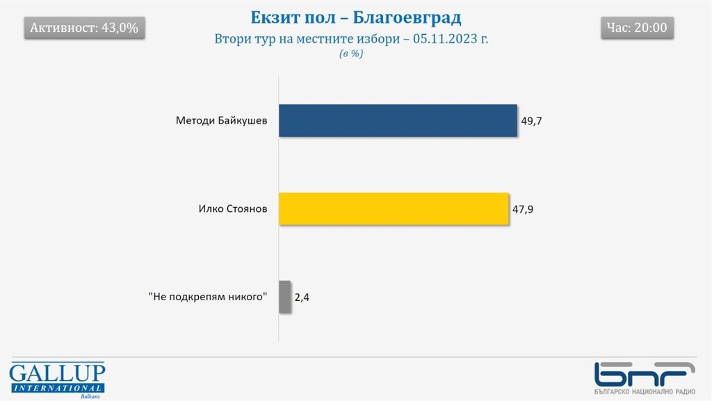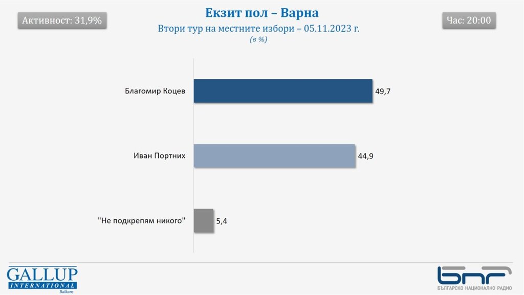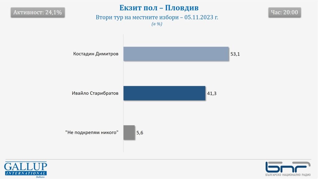 Това сочат данните от екзитпола на "Галъп интернешънъл болкан", партньор на БНР за местния вот, към 20:00 часа.