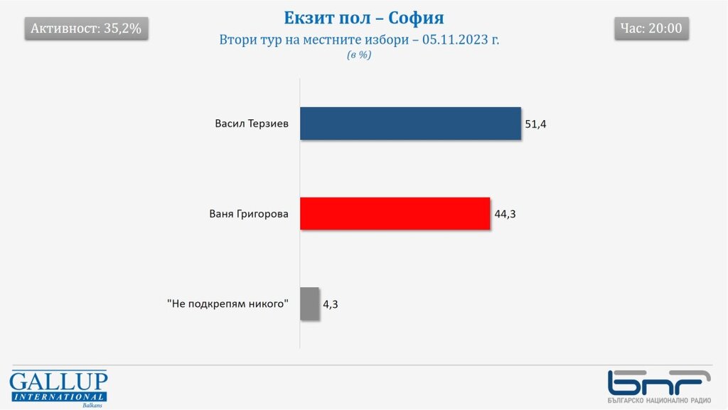 Кандидатът на ПП-ДБ/СС Васил Терзиев се очертава да бъде следващият кмет на София. Това сочат данните от екзит пол на агенцията партньор на БНР на местните избори "Галъп интернешънъл болкан" към 20 часа.