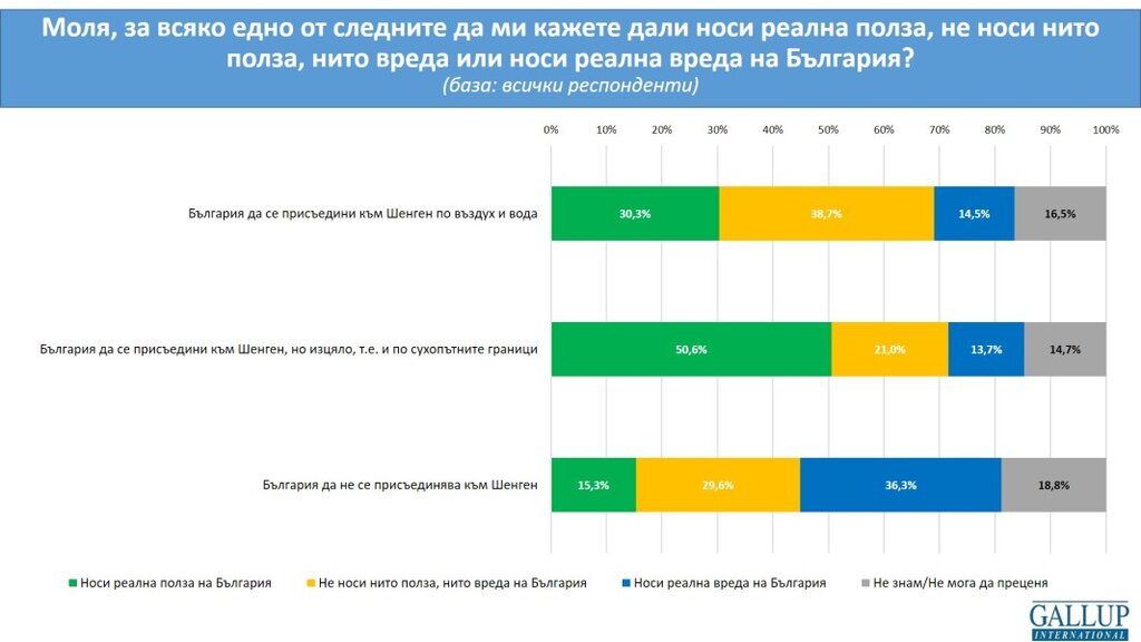 Приемането на България в Шенген по въздух и вода носи реална полза на България, казват 30,3% от пълнолетните българи. Не носи нито полза, нито вреда на България, смятат 38,7%, а 14,5% смятат, че носи реална вреда на България. Останалите не могат да преценят. Така мненията са по-скоро неутрални и дори по-скоро добронамерени, отколкото враждебни. Враждебността идва главно от опозицията, а безразличието личи най-вече при дистанцираните от политиката. Закономерно, привържениците на властта са положително оценяващи. И все пак, изпъкването на „нито полза, нито вреда“ едва ли е най-добрият атестат. Далеч по-добре се оценява перспективата за пълноценно влизане в Шенген. Ще носи реална полза на България, приемат 50,6%, няма да носи нито полза, нито вреда на страната, избират 21%, а 13,7% намират потенциална реална вреда за страната ни. А тогава полезно ли е страната въобще да не влиза в Шенген? 15,3% смятат, че това ще е полезно, 29,6% не намират разлика, но все пак най-сериозен дял намира оставането ни извън Шенген за реална щета – 36,3%. Останалите се колебаят.