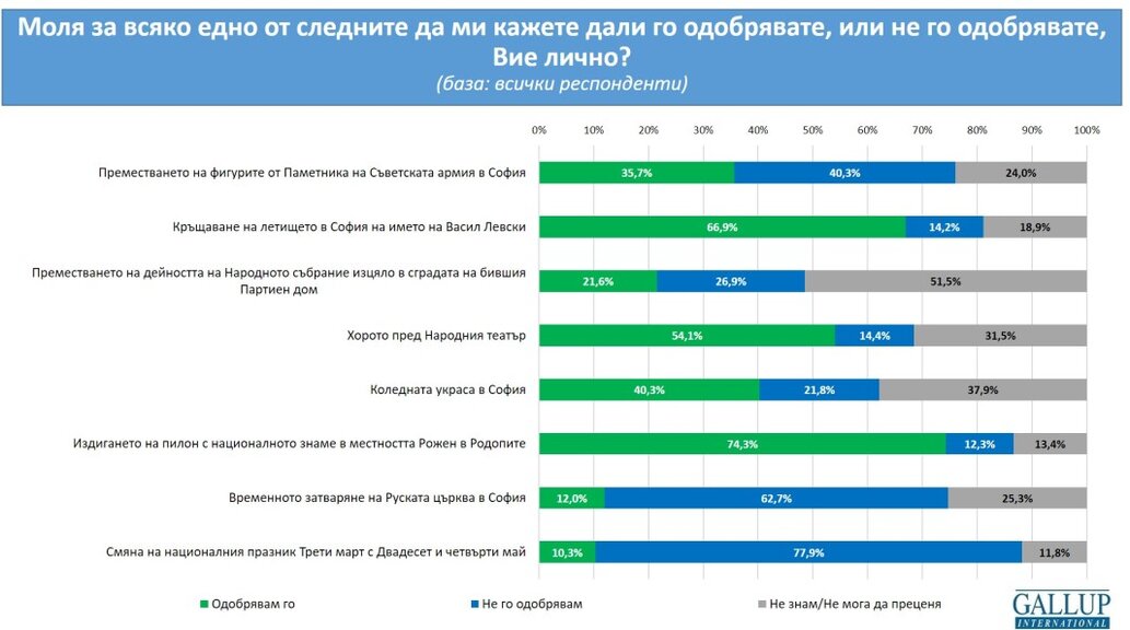 Каква е ситуацията с прословутото хоро пред Народния театър? 54,1% го одобряват, а 14,4% – не. Едва ли обаче популярността на хорото излиза съществено от рамките на социалните медии, затова и спорно е доколко това е действително обществено мнение или става дума също за автоматизъм. В крайна сметка, явно е, че общественият инстинкт е положителен и тук, макар и не без нюанси. В самата София близо две трети одобряват, а само петнайсетина процента са директно против.