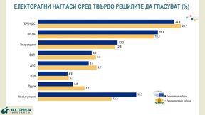 "При национални избори, дори и да са 2 в1 с европейските, но там, където фокусът ще е върху националната проблематика, позициите на ГЕРБ-СДС пред ПП-ДБ са около 5 - 5,5% по-високи, според проучването на "Алфа рисърч", уточни тя и добави, че в преговорите и двете страни се опитват да отвоюват максимално добри позиции за себе си.