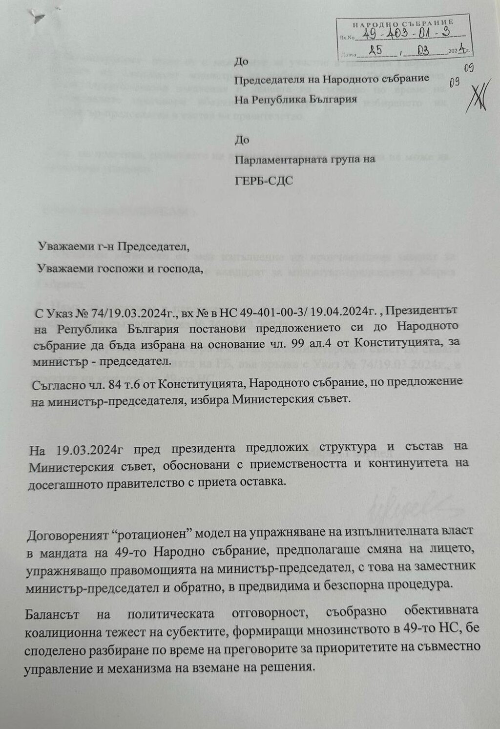 Дойде реакция и от министър-председателя в оставка Николай Денков, който призова ГЕРБ-СДС да изпълни уговорката отпреди 9 месеца за ротация в кабинета и да продължи управлението за още 9 месеца, без персонални промени в кабинета, а само с промяна на министър-председателския пост, който трябва да бъде зает от Мария Габриел, за да може страната да влезе в Шенгенското пространство и еврозоната.По-късно днес се очаква официална позиция от коалиция ПП-ДБ.