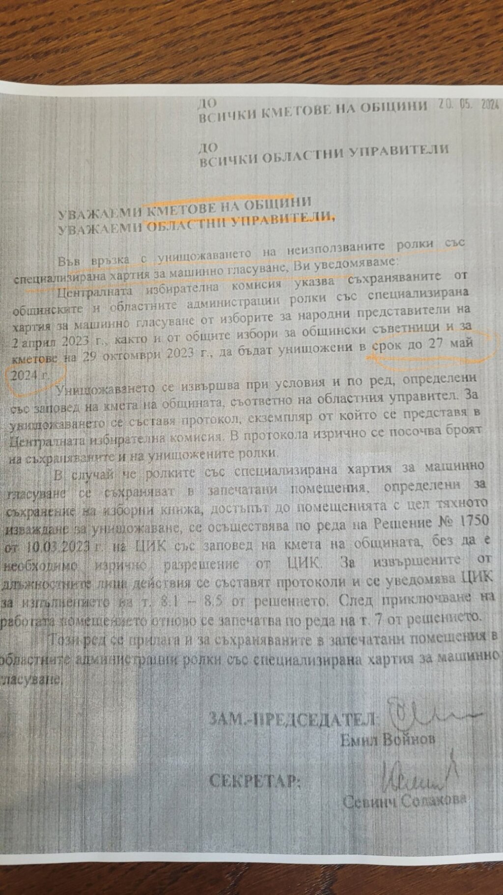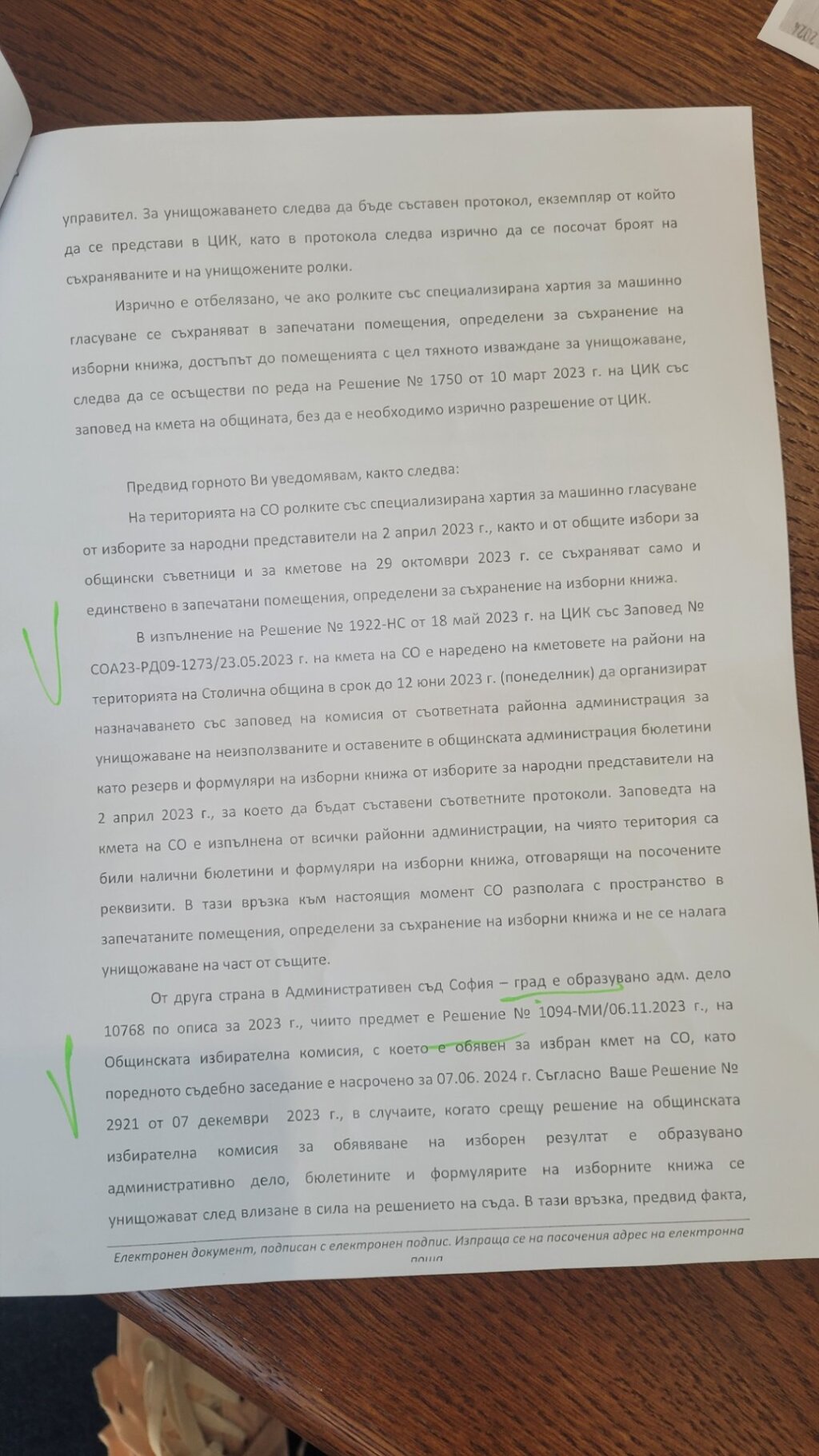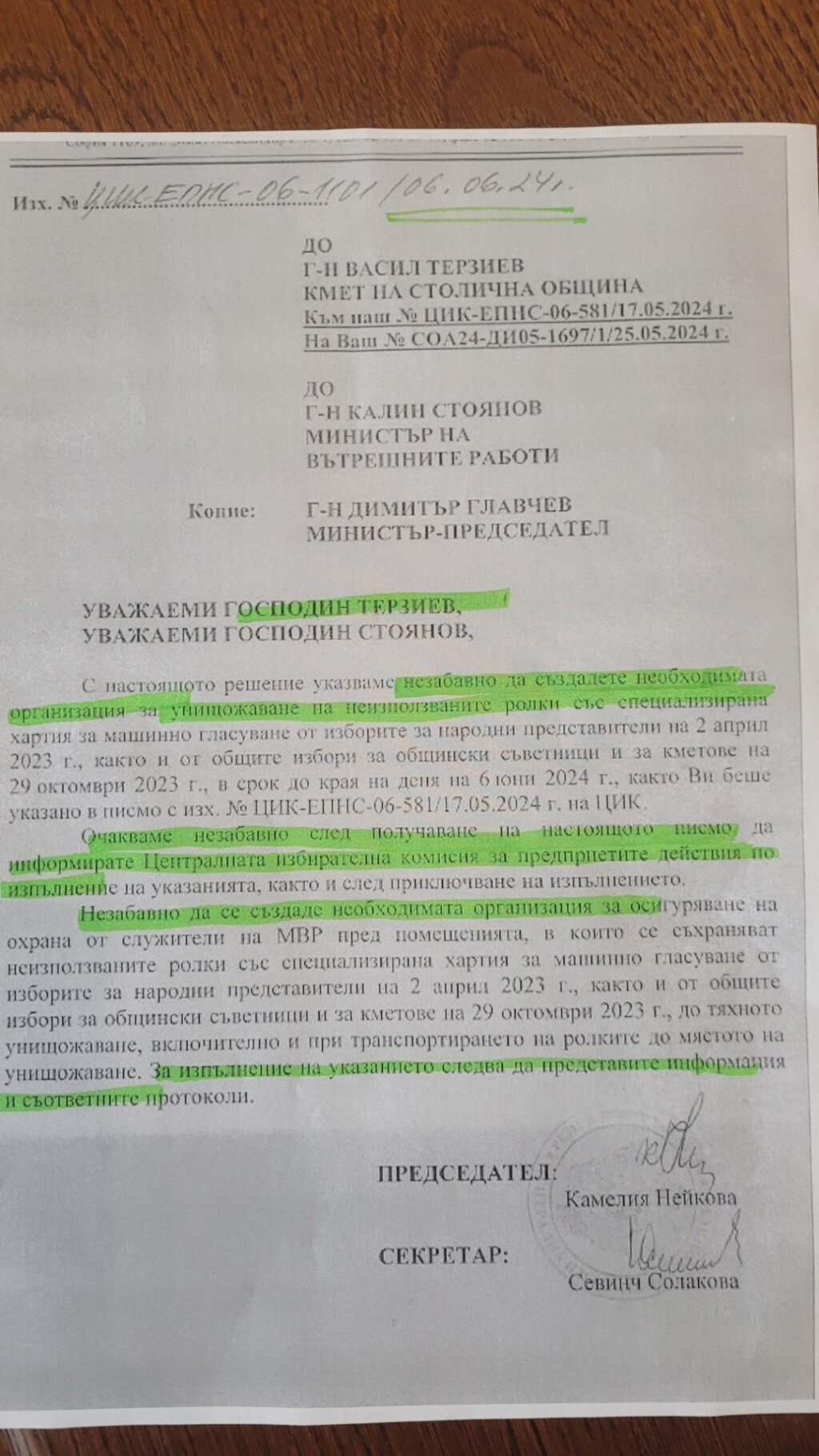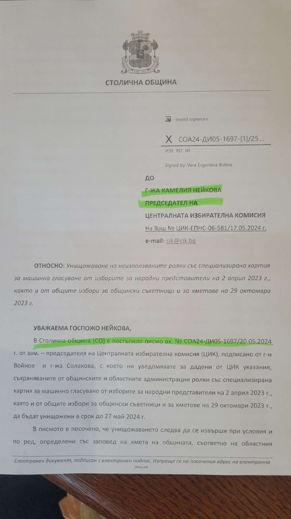 Парламентарно представена политическа партия сигнализира, че Столичната община отказва да изпълни указание на ЦИК за унищожаване на неизползваните ролки със специална хартия за машинно гласуване от парламентарните избори от 2 април 2023 и местните избори от октомври миналата година. Нареждането е от 20 май.