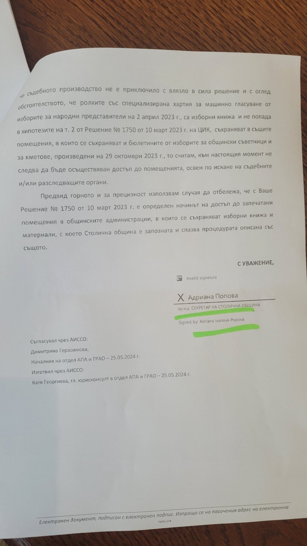 На 25 май до ЦИК е изпратен отговор от Столичната община. В него се казва, че ролките са изборни книжа и когато има съдебно обжалване на резултати, книжата се съхраняват в запечатани помещения до произнасяне на съда.