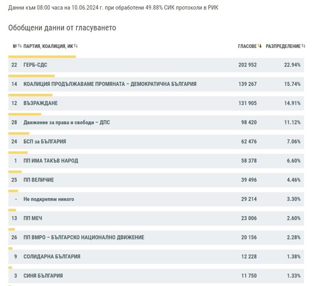 ГЕРБ-СДС е първа политическа сила с 22,94% и в проведените избори за евродепутати при обработени 49,88% от СИК протоколите.