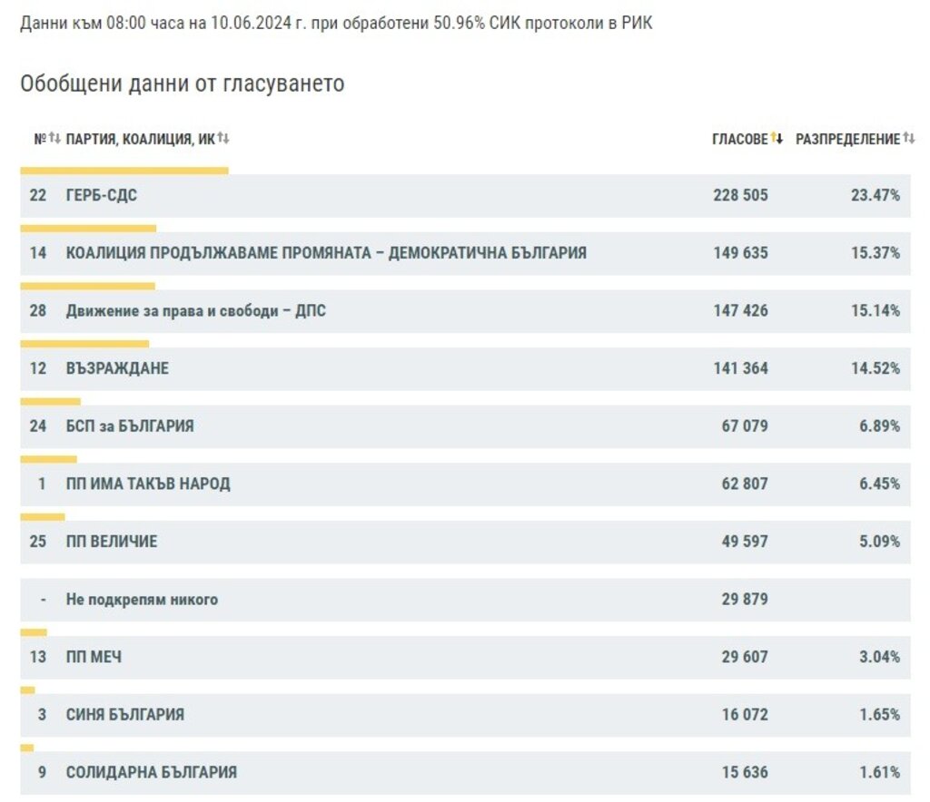 Седем политически партии и коалиции ще влязат в 50-тото Народно събрание, показват междинни данни на Централната избирателна комисия при обработени 50,96% от секционните избирателни протоколи.