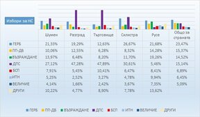 Според междинните данни, предоставени от ЦИК, които могат да се променят след въвеждането на протоколите от гласуването по области и при повторната им обработка в ЦИК става ясно, че ГЕРБ-СДС доминира в повечето от областите: Благоевград, Бургас, Варна, където "Възраждане" е на второ място, във Велико Търново, където "Възраждане" превишава подкрепата за ПП-ДБ с повече от 5%.