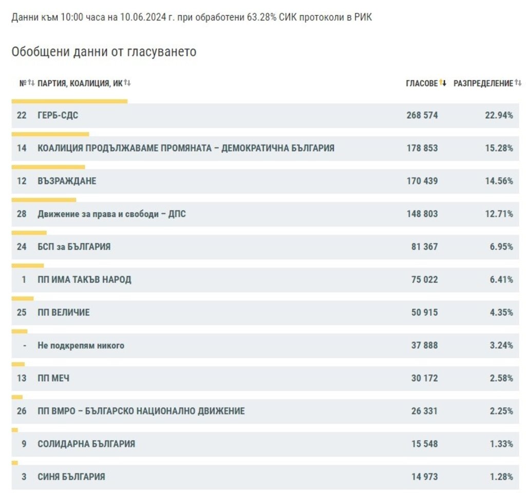 ГЕРБ-СДС е първа политическа сила с 22,94% и на проведените избори за евродепутати при обработени 63,28% от СИК протоколите.