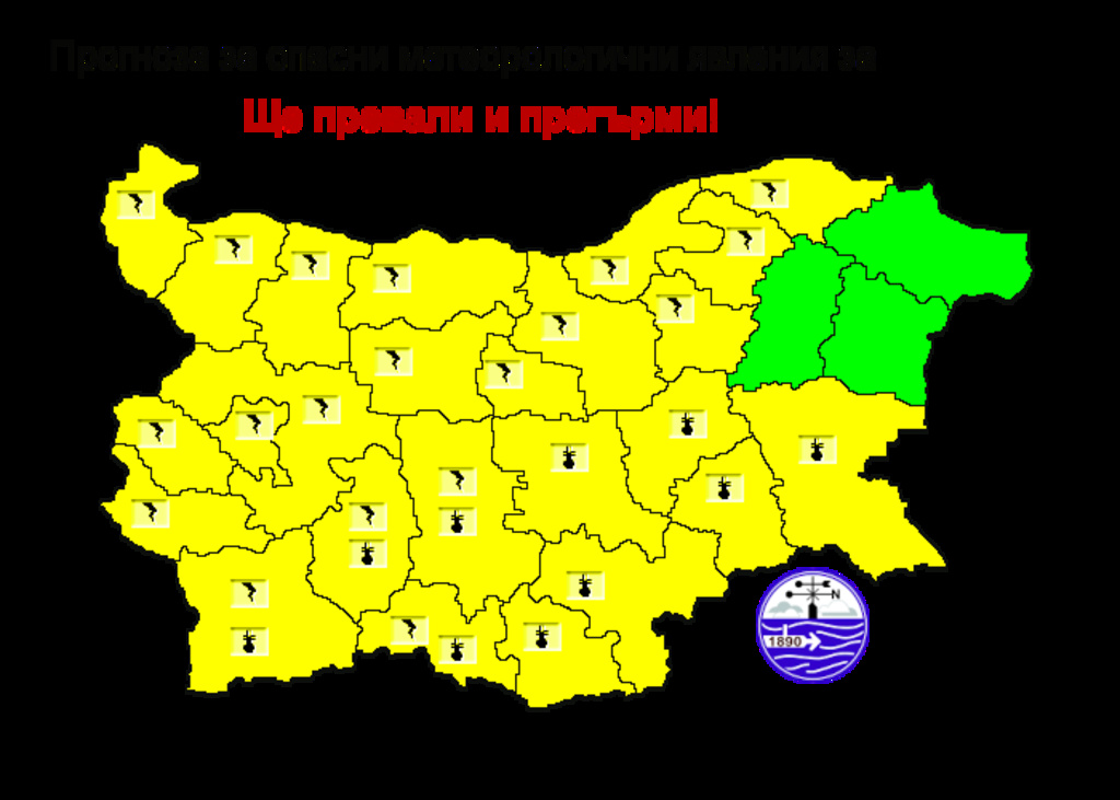 Жълт код за високи температури издаде Националният институт по метеорология за области предимно в южната и югоизточната част на страната. За Северна и Северозападна България кодът е за гръмотевична дейност, очакват се превалявания (виж графиката по-долу).