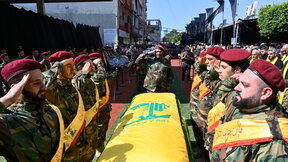 Лидерът на "Хизбула" Хасан Насрала изнася реч по видеовръзка на възпоменателна церемония за отбелязване на една седмица от убийството на командир Фуад Шукр в Бейрут, Ливан, 6 август 2024 г.