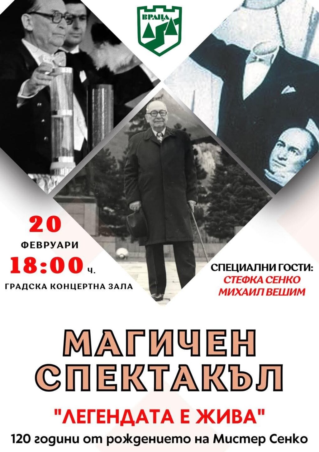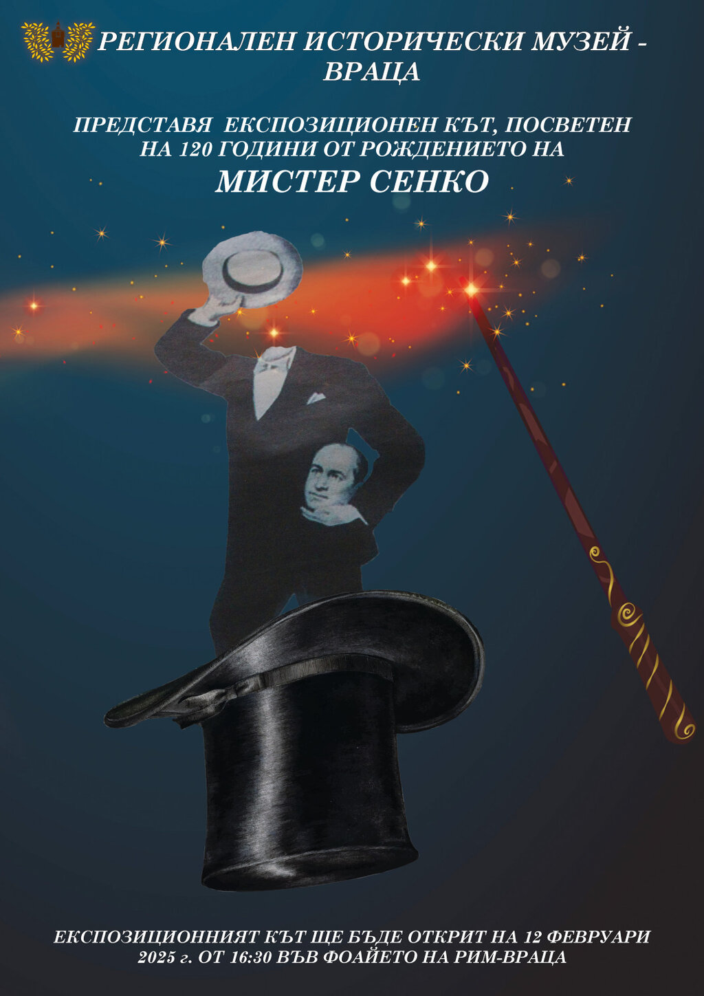 Това е Мистер Сенко, великият илюзионист, чието име и сега е на афиши в родната му Враца. Днес, когато се навършват 120 години от рождението му, в Регионалния музей в града ще бъде открит изложбен кът с негови вещи, дарени от снаха му Стефанка Сенко. Ще бъдат показани плакати за представленията му, някои от наградите му, документи и най-ценното - един от сценичните му костюми.