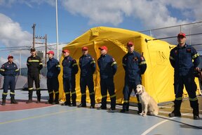 Гръцкият премиер Кириакос Мицотакис, вдясно в центъра, във временния щаб на службите за спешна помощ, създаден във връзка със земетресенията в района на гръцкия вулканичен остров Санторини, 7 февруари 2025 г.