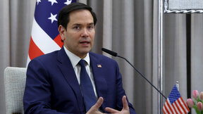 Президентът на Франция Еманюел Макрон (вляво) се ръкува с държавния секретар на САЩ Марко Рубио (вдясно) до специалния пратеник на САЩ Стийв Уиткоф преди среща в Елисейския дворец в Париж, Франция, 17 април 2025 г.