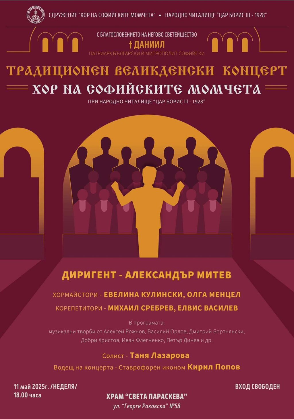 На 11 май от 18.00 часа в православния храм "Св. Параскева" ще се състои традиционният Великденски концерт на Хора на софийските момчета. Водещ концерта ще е ставрофорен иконом д-р Кирил Попов, а солист ще бъде сопраното Таня Лазарова.