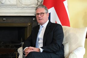 Хусам Зомлот, посланик на палестинската мисия в Обединеното кралство, издига палестинско знаме по време на церемония в Лондон, 22 септември 2025 г