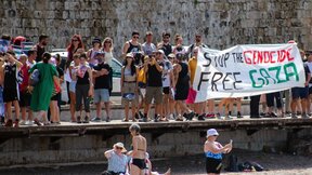 "Идваме с послание "Мир за Палестина" и почит към героите от флота "Сумуд", най-вече за героя, който представи България" - казва Мустафа, един от стотиците събрали се в подкрепа на Палестина. На много плакати като неговия се вижда името на Васил Димитров, който е част от флота.
