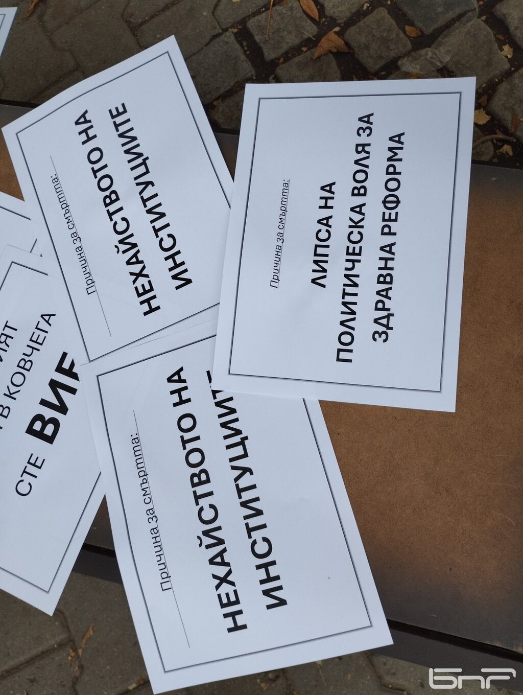 На протеста пред здравното министерство младите медици донесоха ковчег, както и огромен букет с цветя, който раздадоха всички, които желаят да изпратят бъдещето си в България със символично траурно шествие.