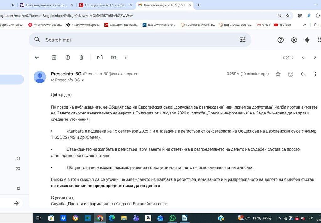 От Съда на ЕС уточняват, че жалбата е подадена на 15 септември 2025 г. и е заведена в регистъра от секретариата на Общия съд на Европейския съюз.