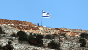 Израелски войници стоят до израелско знаме от ливанската страна на границата, близо до южното ливанско село Марун ал-Рас, 26 ноември 2024 г., на фона на трансгранични военни действия между "Хизбула" и Израел.