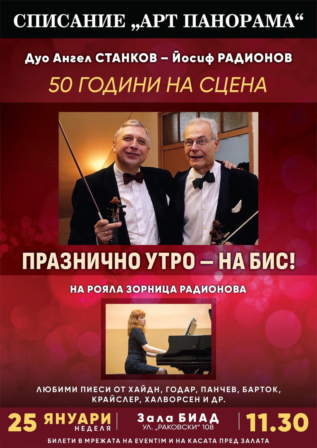 Цигулковото дуо на професорите Ангел Станков и Йосиф Радионов отбелязва респектиращ юбилей - 50 творчески години. Двамата обичани музиканти ще го отпразнуват на сцената - с концерт матине в неделя, 25 януари, в столичната зала "Биад" от 11.30 ч.