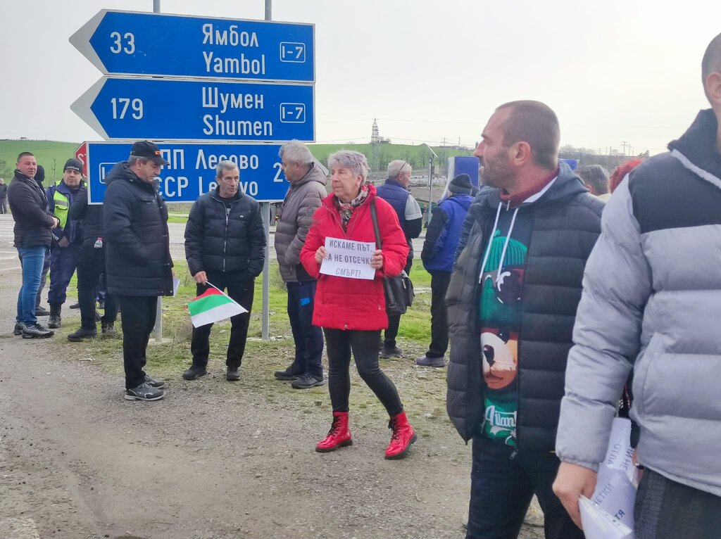 Недоволните се събраха в близост до първокласния път I-7 в знак на протест срещу условията, при които са принудени да шофират всеки ден по пътя Елхово-Ямбол: