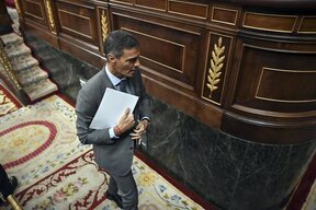Испанският министър-председател Педро Санчес (вляво) и испанският крал Фелипе VI  в парламента в Мадрид, 17 февруари 2026 г.