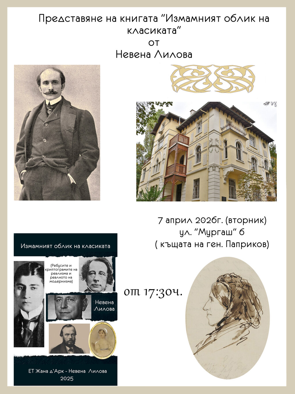 От 17:30 часа на 7 април в историческа къща на ген. Паприков на ул. "Мургаш", 6 в София ще бъде представена книгата на Невена Лилова - "Измамният облик на класиката (ребусите и криптограмите на реализма и реалното в модерна)", сборник статии и студии.