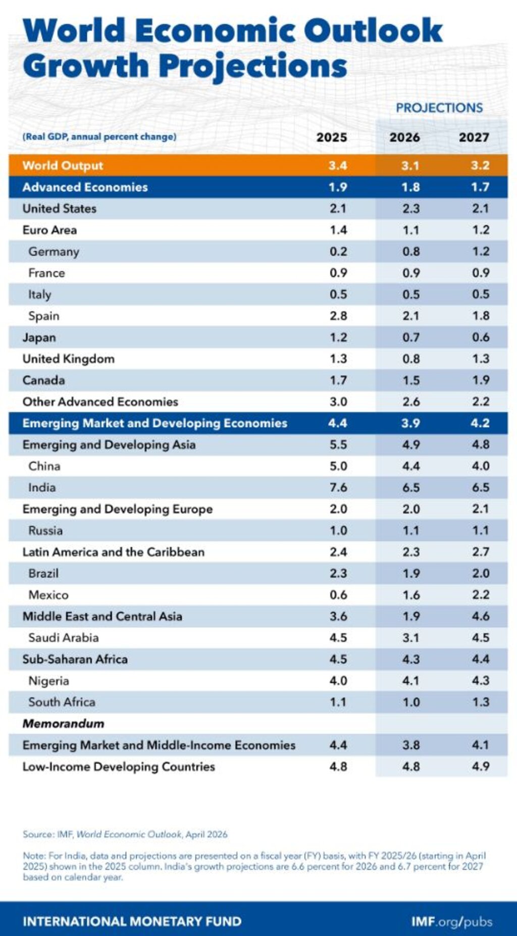 МВФ прогнозира, че световната икономика ще нарасне с 3,1% през 2026 г., което е по-малко от предишната прогноза от 3,3%, докато прогнозата за 2027 г. остава непроменена на ниво от 3,2%. Очаква се глобалната инфлацията да се повиши до 4,4% през 2026 г., преди да спадне до 3,7% догодина.